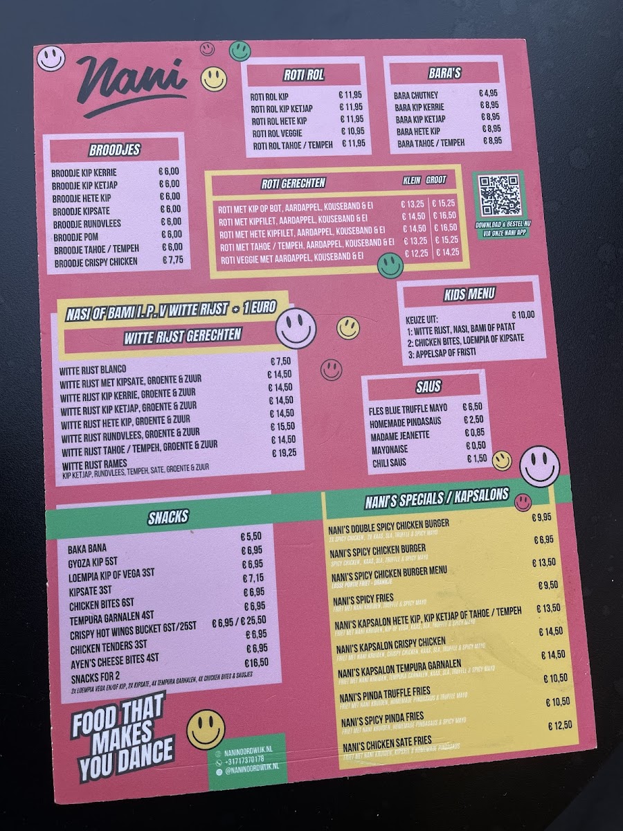 At Nani Noordwijk | Sweet Surinamese Food, the menu feels built for diners who want bold, satisfying comfort food with plenty of choice between rice, noodles, wraps, and hearty combos. If you’re after something filling and crowd-pleasing, Kapsalon stands out as a go-to option with its layered, indulgent style that’s ideal when you want a full meal in one tray. For rice lovers, Nasi Goreng with Beef delivers a classic fried-rice direction that leans into savory depth, while noodle fans can rotate between options like Hete Kip Bami Groente for a spicier kick paired with vegetables, or Bami Met Pikante Kip when you want that same warmth in a more straightforward, chicken-forward format. The menu also makes it easy to order for sharing (or for serious appetites) thanks to Bucket Crispy Hotwings, and it gets even more tempting with combination plates like Bami Nasi Rames En Crispy Hotwings, which bundle variety into a single order. If you want something traditionally comforting and complete, Roti Compleet provides that all-in-one feeling of a proper, balanced plate, while Hete Kip Met Patat is a simple, satisfying match of spicy chicken with fries for an easy, no-fuss choice. Overall, the highlighted items show a menu that stays focused on rich flavors, generous portions, and mix-and-match practicality-perfect for anyone who wants Surinamese-inspired fast comfort without overcomplicating the decision.
